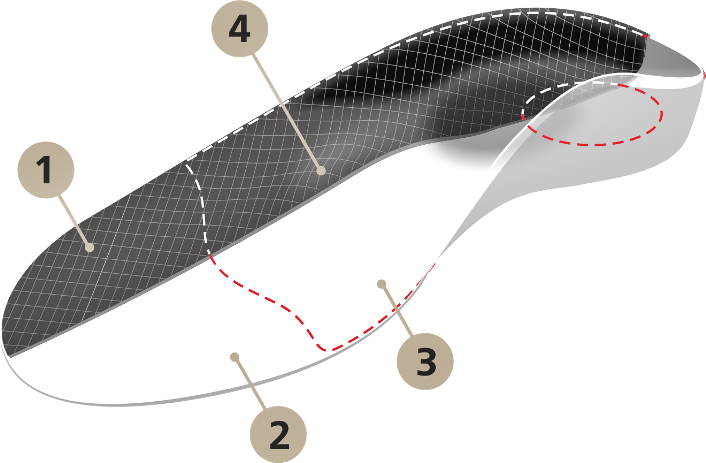 3. Пластиковый каркас с высокими боковыми бортиками, продленными до 2\3 стельки, обеспечивает надежную фиксацию стопы в нейтральной позиции и поддерживает своды стопы.